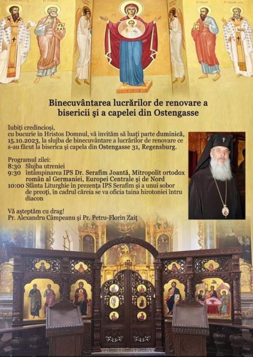 Auf Einladung von Metropolit Seraphim besuchte der Direktor des Ostkircheninstituts, Dr. theol. habil. Dietmar Schon o.p., am 15. Oktober 2023 die Regensburger Gemeinde der rumänischorthodoxen Metropolie. Er konnte an einem besonderen Ereignis teilnehmen: Nachdem die St. Matthias-Kirche in der Regensburger Ostengasse nach einer gründlichen Renovierung von Bischof Dr. Rudolf Voderholzer wieder für den liturgischen Gebrauch eröffnet wurde, wurde sie von der katholischen Diözese der rumänischen orthodoxen Gemeinde von Regensburg erneut zur Feier ihrer Gottesdienste übergeben. Aus diesem Anlass zelebrierte Metropolit Dr. Serafim Joanta am 15. Oktober 2023 die erste Liturgie in der neu gestalteten Kirche und spendete dabei auch eine Diakonsweihe.